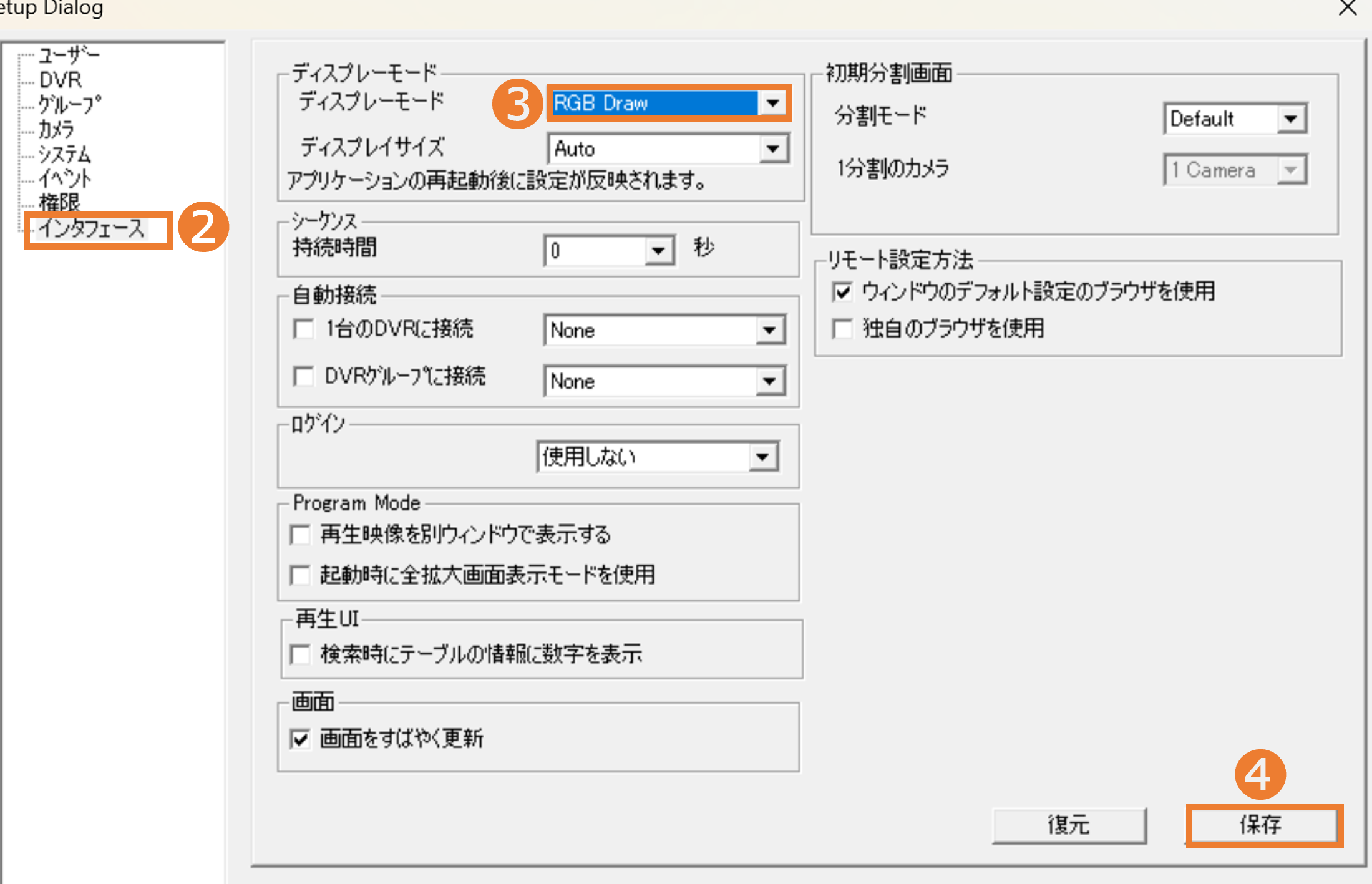 ❷[インタフェース] > ❸ディスプレーモードを[RGBDraw]に変更 > ❹[保存] > 再起動