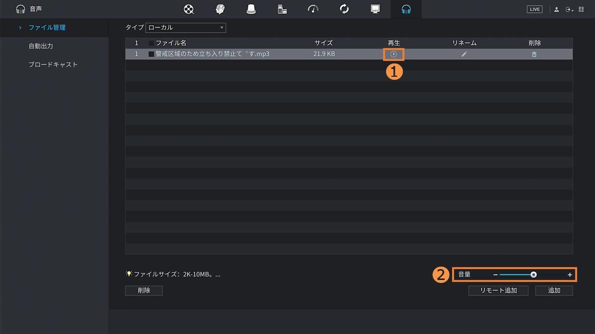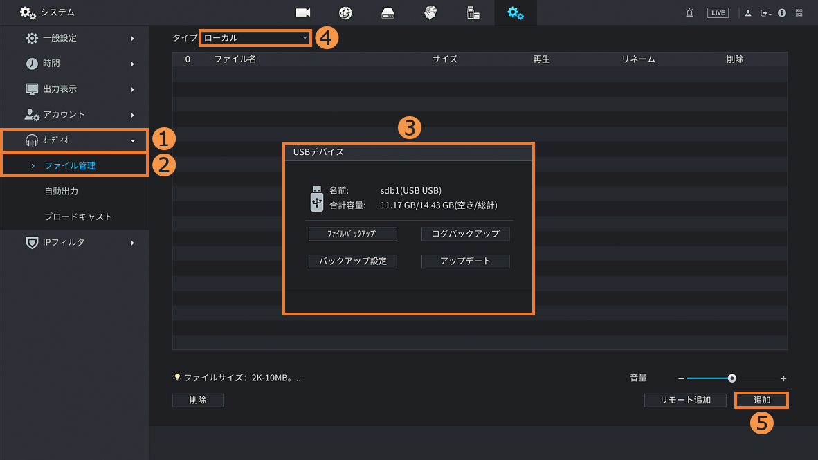 ❶[オーディオ] > ❷[ファイル管理]をクリックし、USBメモリをレコーダー本体の前面 or 背面の空きポートに差込むと、❸[USBデバイス認識メッセージ]が表示されるため、右クリックでメッセージ画面を閉じます。> ❹[タイプ]からローカルを選択 > ❺[追 加]をクリックします。