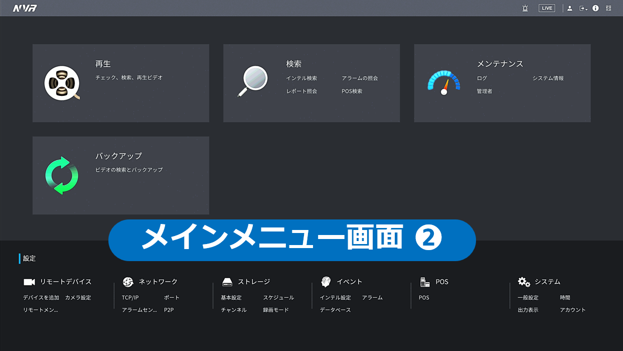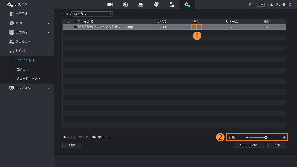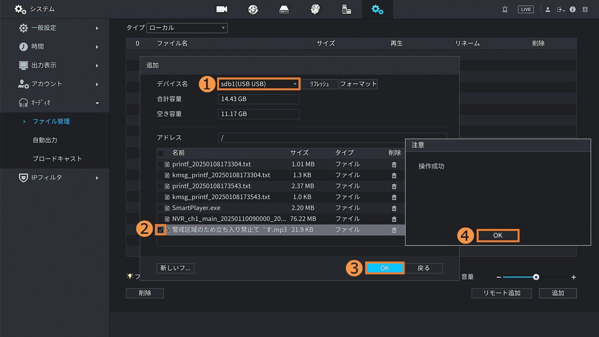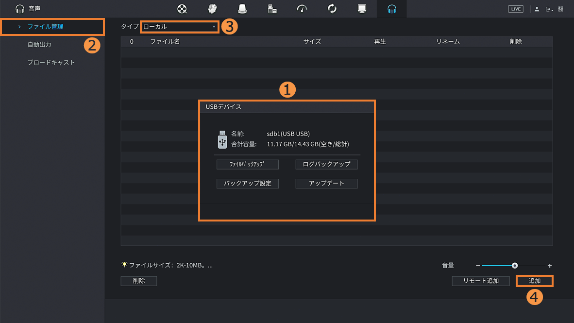 USBメモリをレコーダー本体の前面 or 背面の空きポートに差込むと、❶[USBデバイス認識メッセージ]が表示されるため、右クリックでメッセージ画面を閉じます。> ❷[ファイル管理] > ❸[タイプ]からローカルを選択 > ❹[追加]をクリックします。