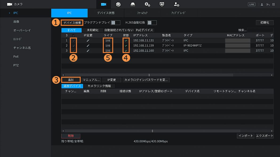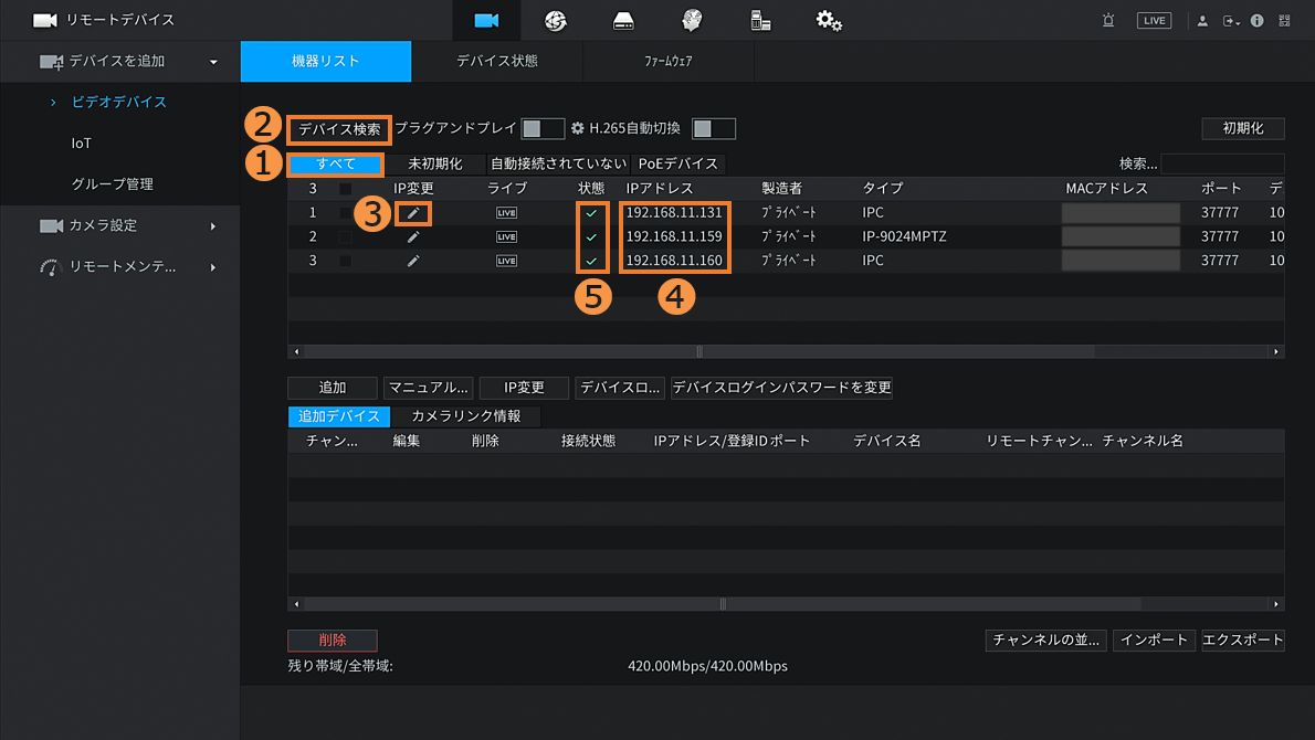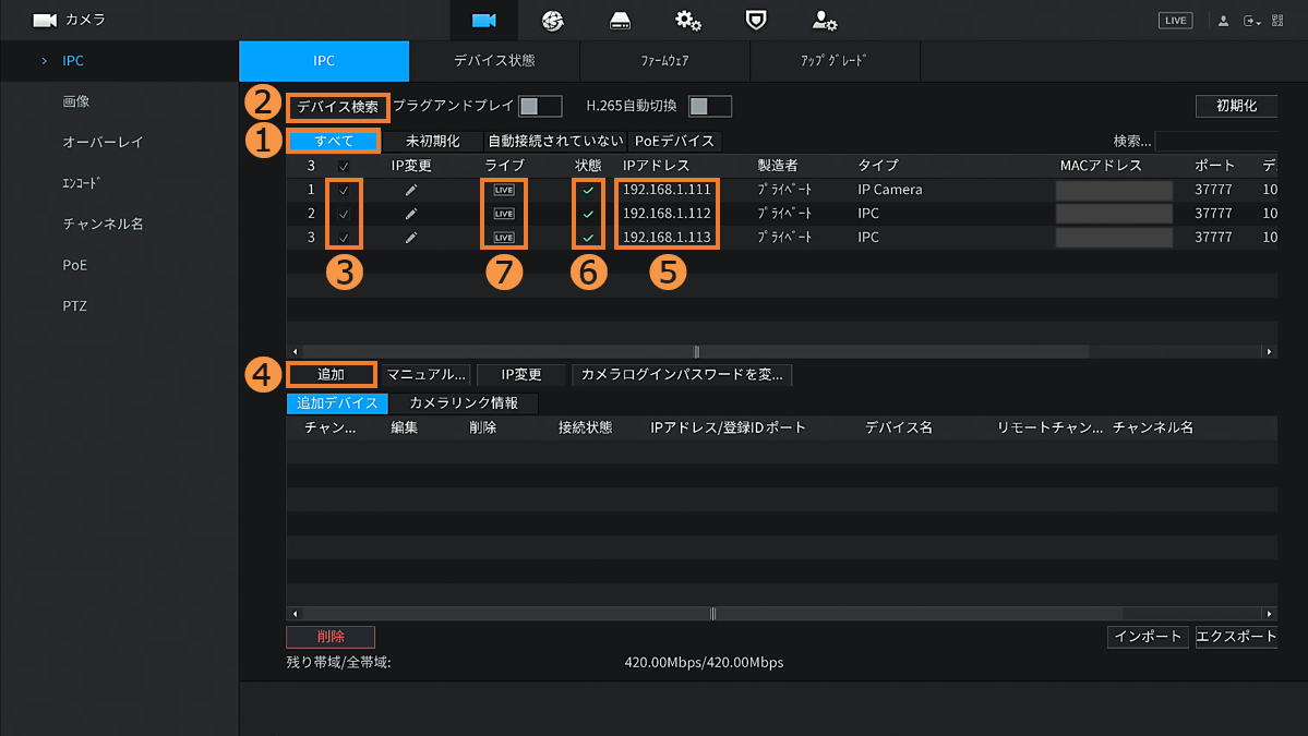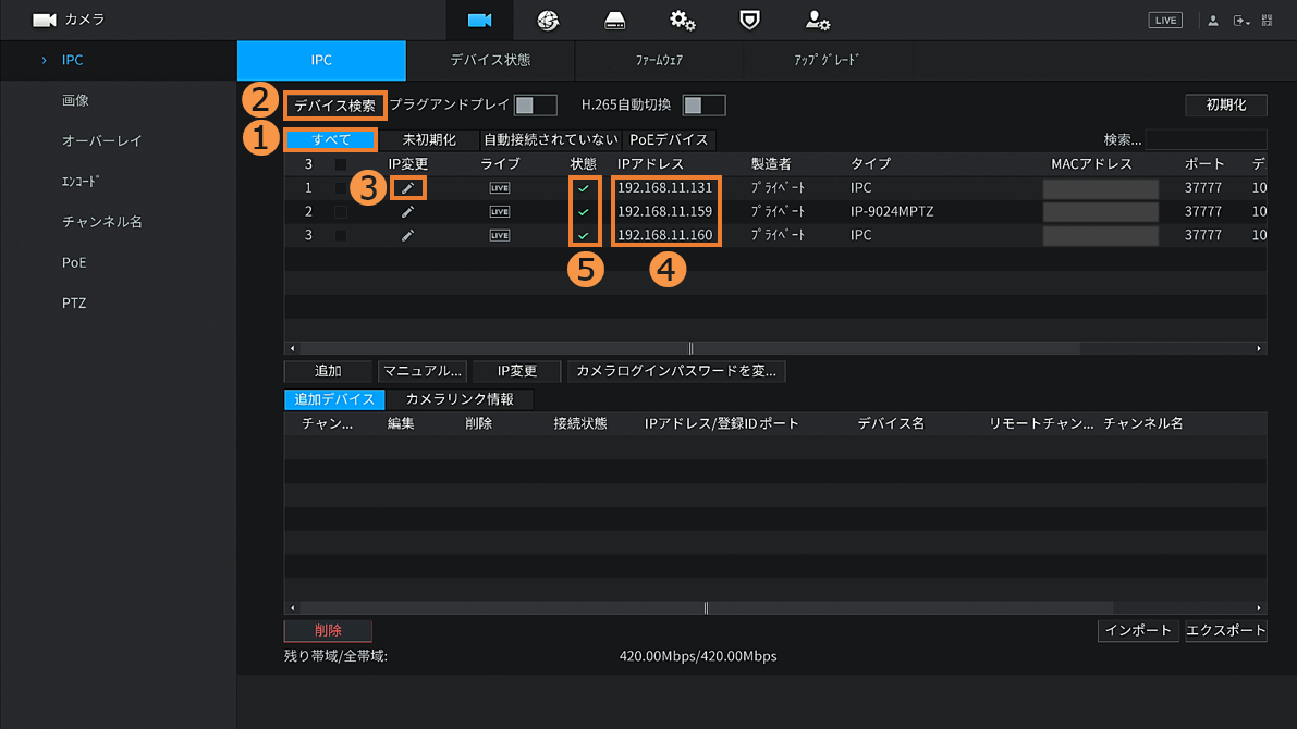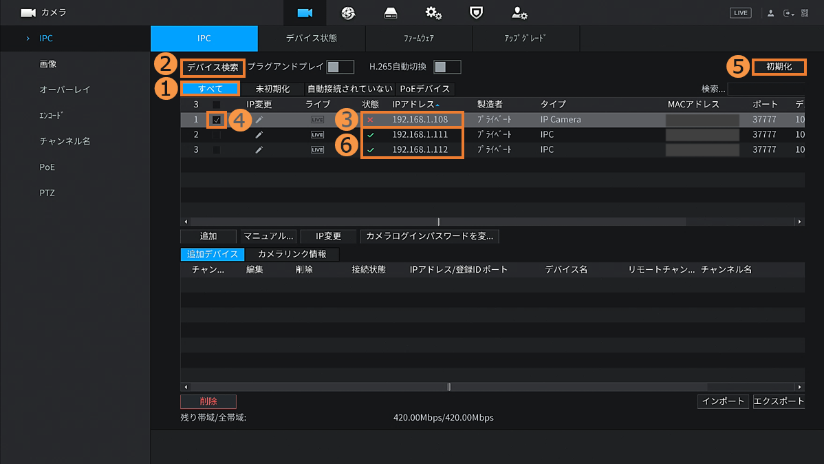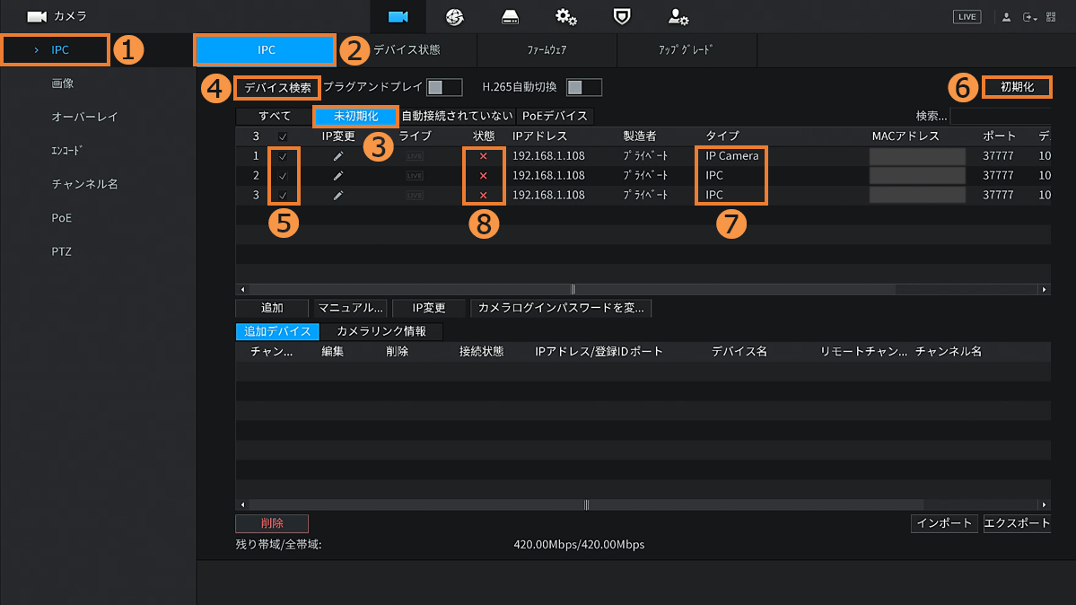 ※❼[タイプ]が[IPC・IP Camera・IP PTZ Camera・カメラ型番等]=カメラ、❽[状態]が[✖]=未初期化デバイスです。