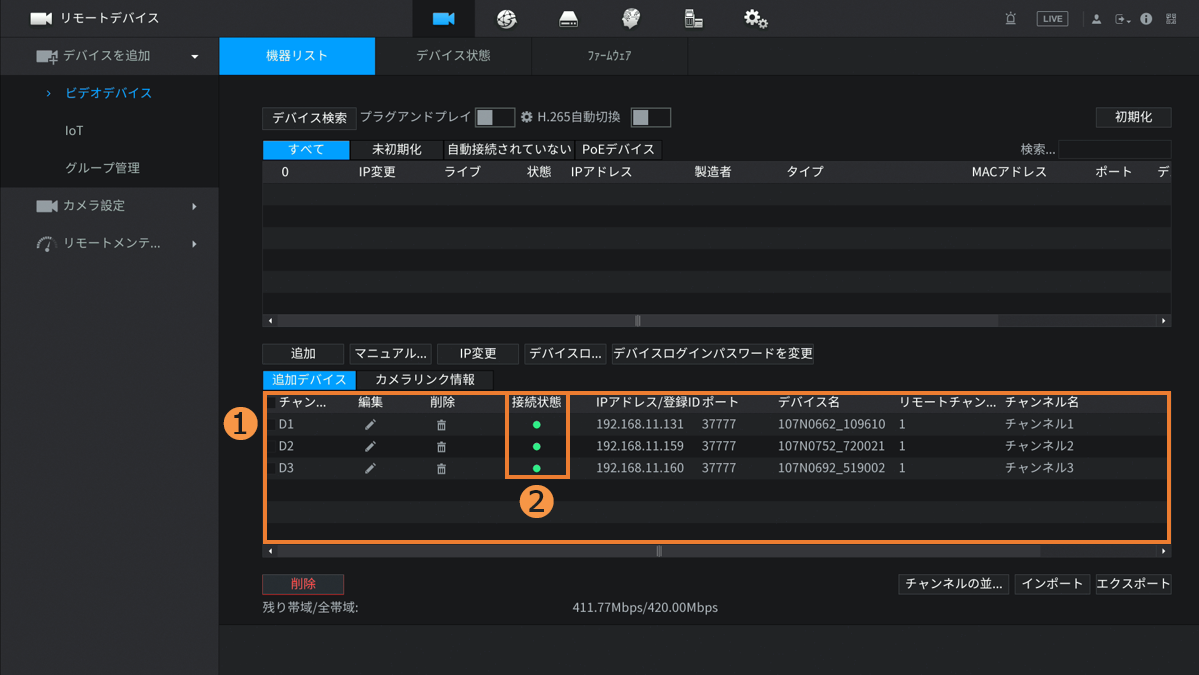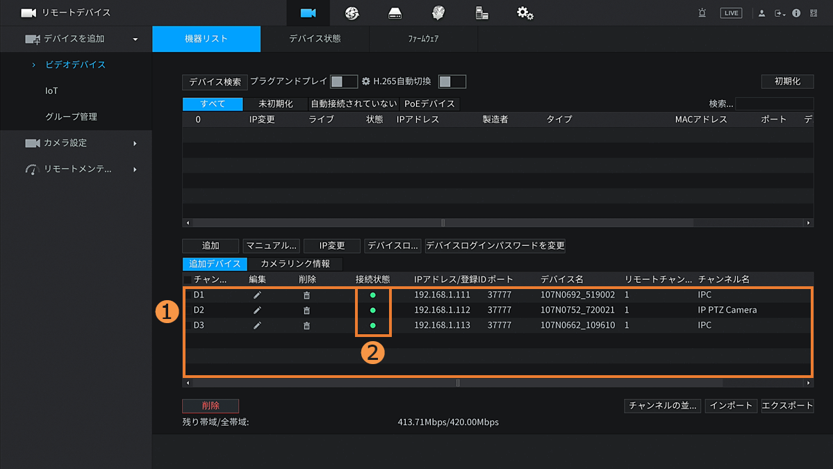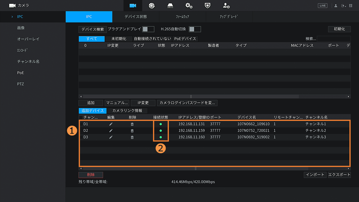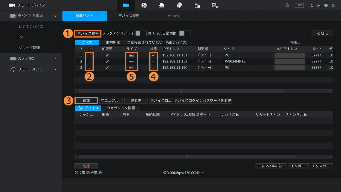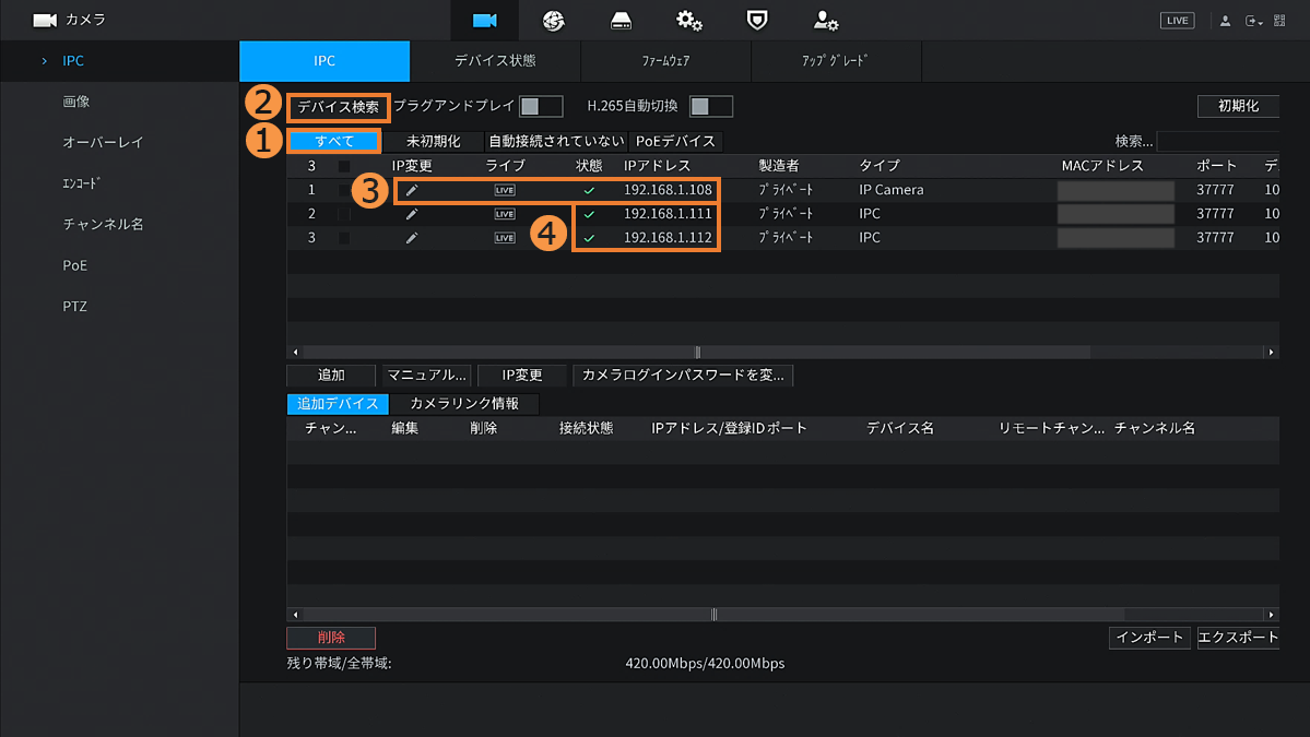 ※❼[タイプ]が[IPC・IP Camera・IP PTZ Camera・カメラ型番等]=カメラ、❽[状態]が[✖]=未初期化デバイスです。