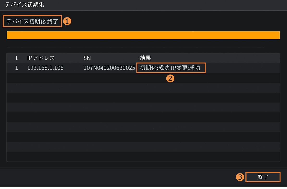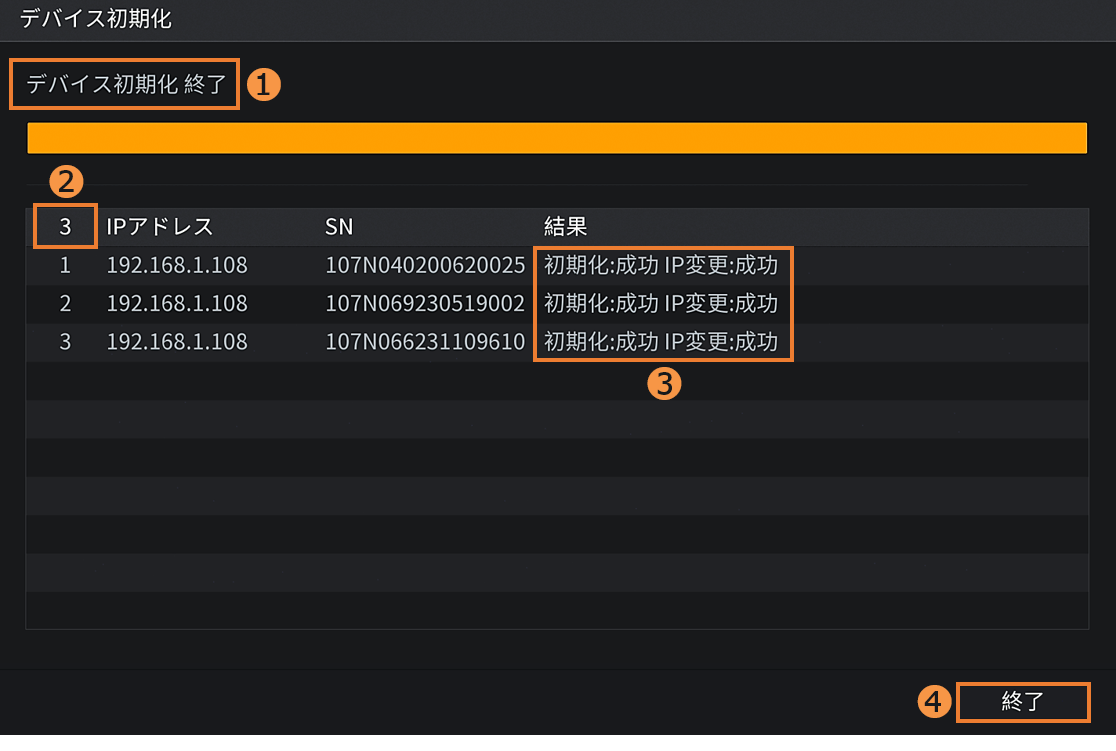 ❶[デバイス初期化 終了]が表示後、❷で対象デバイスの台数と、❸[結果]欄で[初期化・IP変更]の結果を確認します。