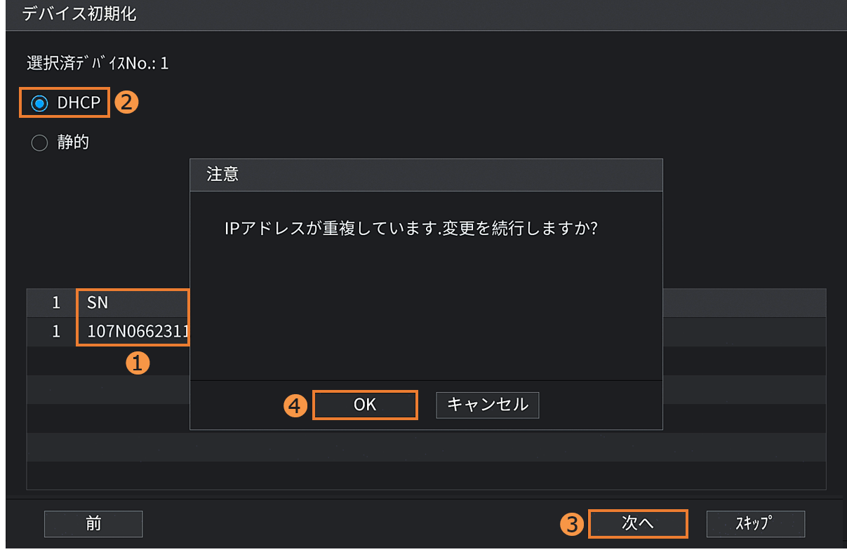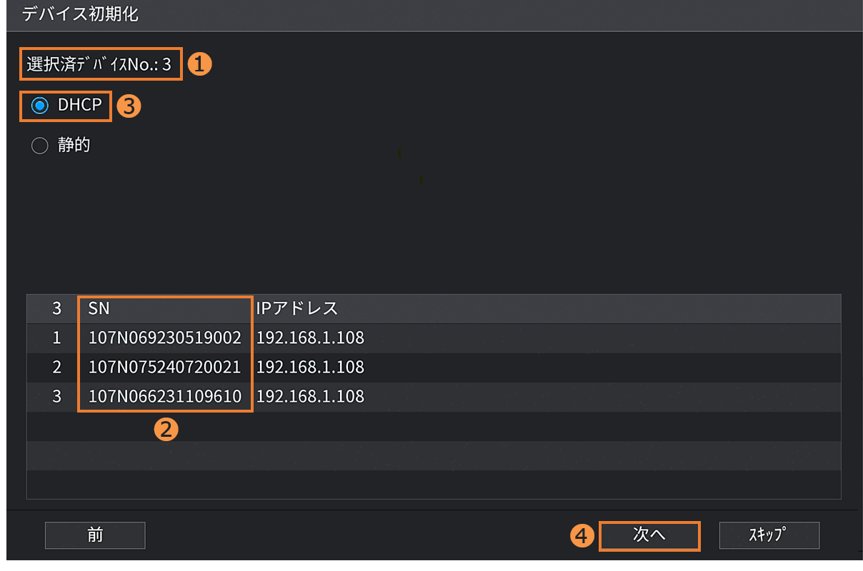 ❶[選択済デバイスNo.]で対象デバイスの台数、❷[SN]欄でシリアルを確認 > ❸[DHCP]を選択 > ❹[次へ]をクリックします。
