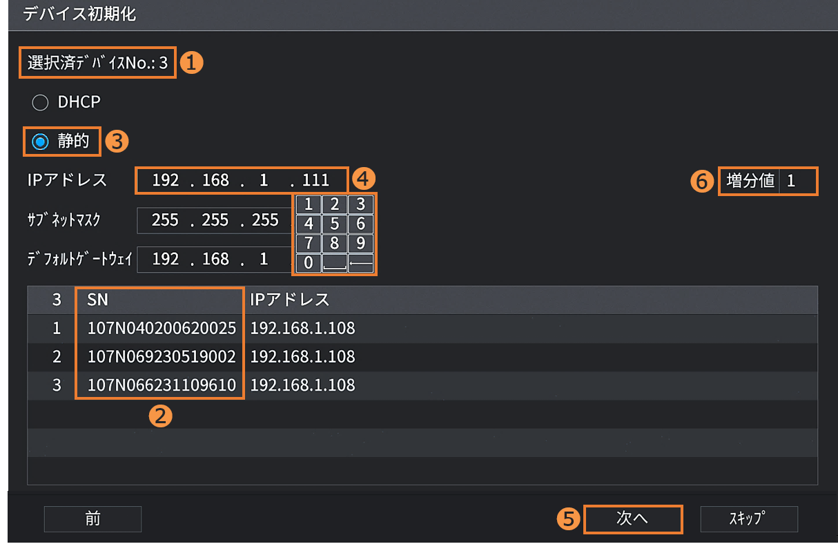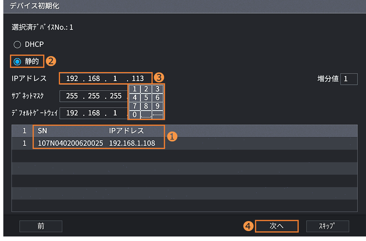 ❶[SN] , [IPアドレス]欄で対象カメラを再確認 > ❷[静的]を選択 > ❸[IPアドレス]を押下し、ホスト部を任意の数値に変更*※* > ❹[次へ]をクリックします。