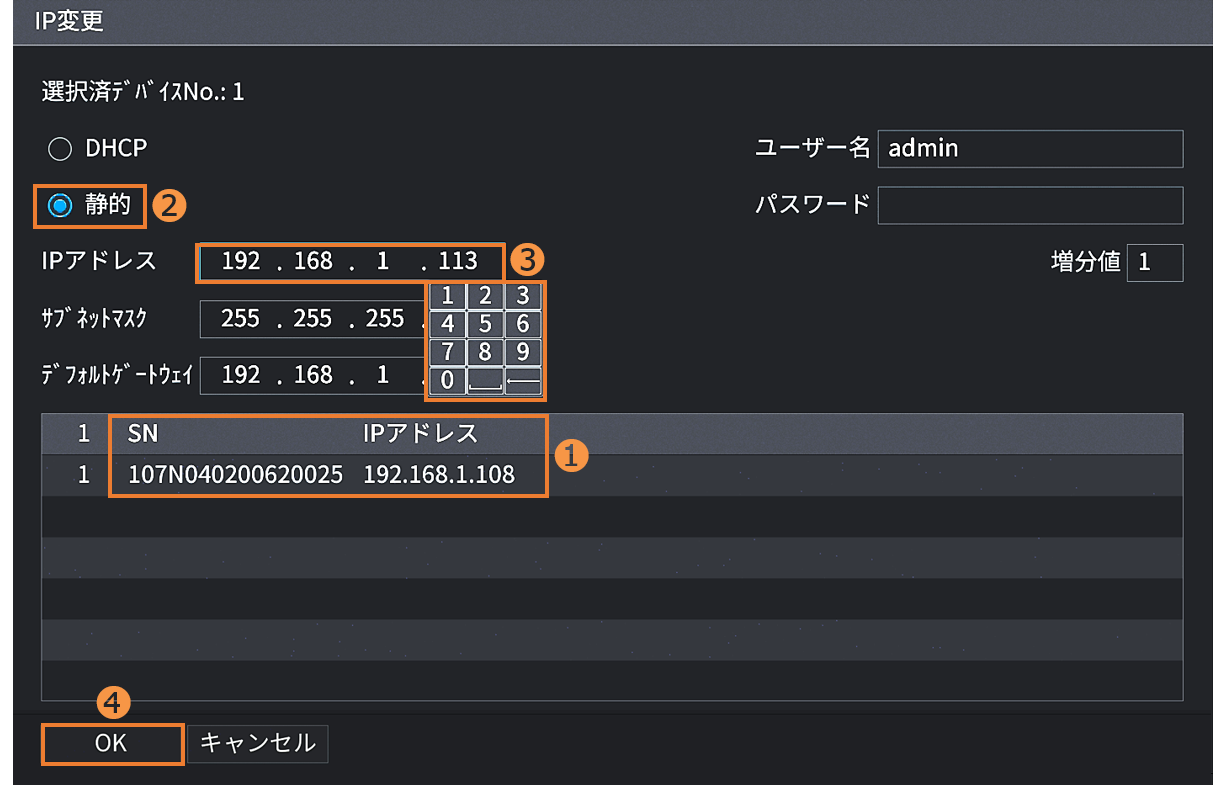 ❶[SN] , [IPアドレス]欄で対象カメラを再確認 > ❷[静的]を選択 > ❸[IPアドレス]を押下し、ホスト部を任意の数値に変更*※* > ❹[OK]をクリックします。