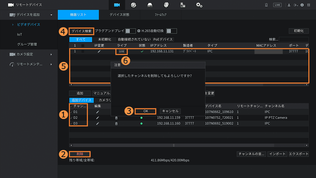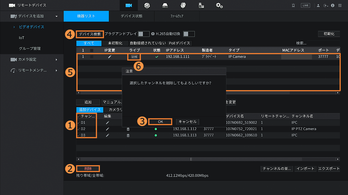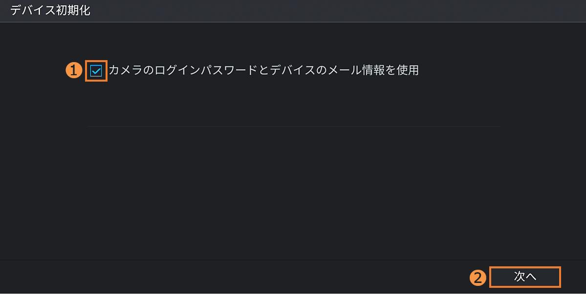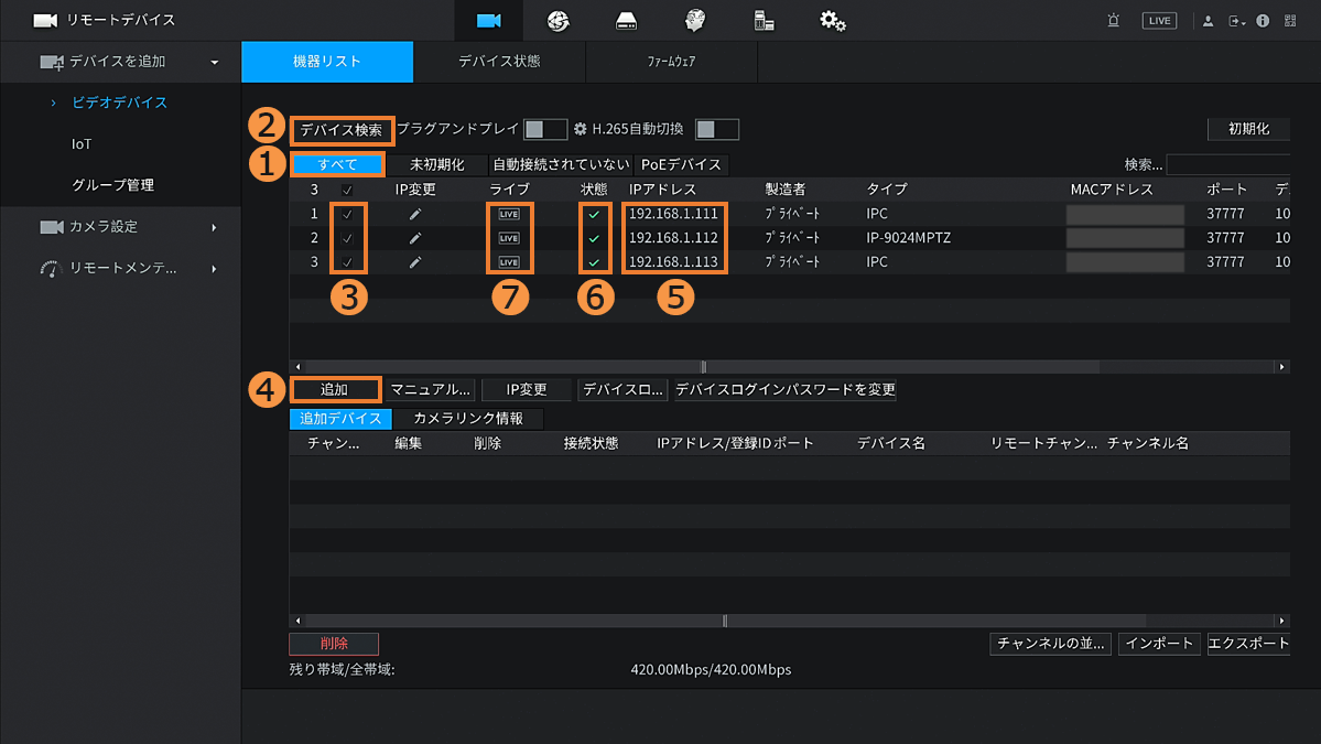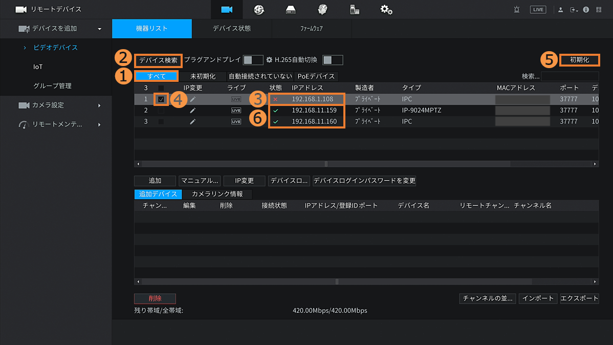 ❶[デバイスを追加] > ❷[ビデオデバイス] > ❸[機器リスト] > ❹[未初期化] > ❺[デバイス検索] > ❻対象のカメラへ[✔]※ > ❼[初期化]をクリックします。