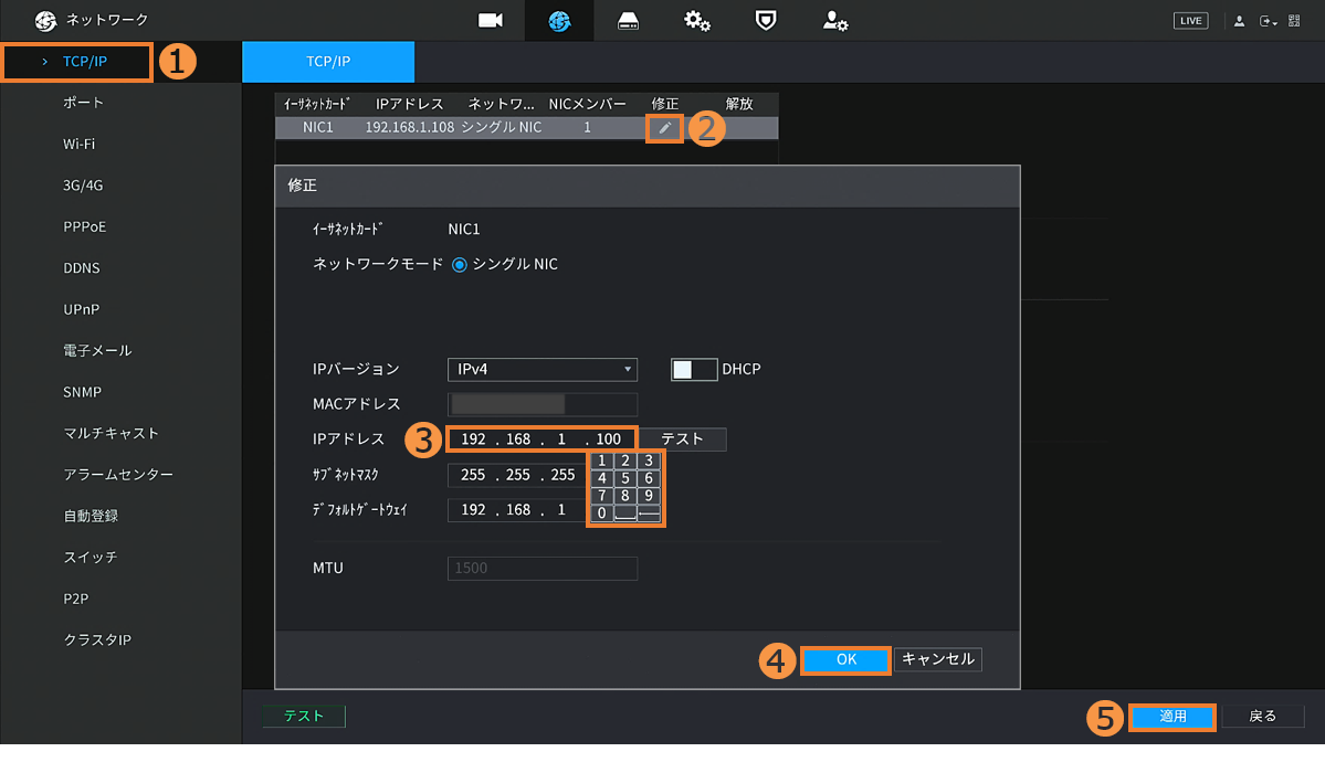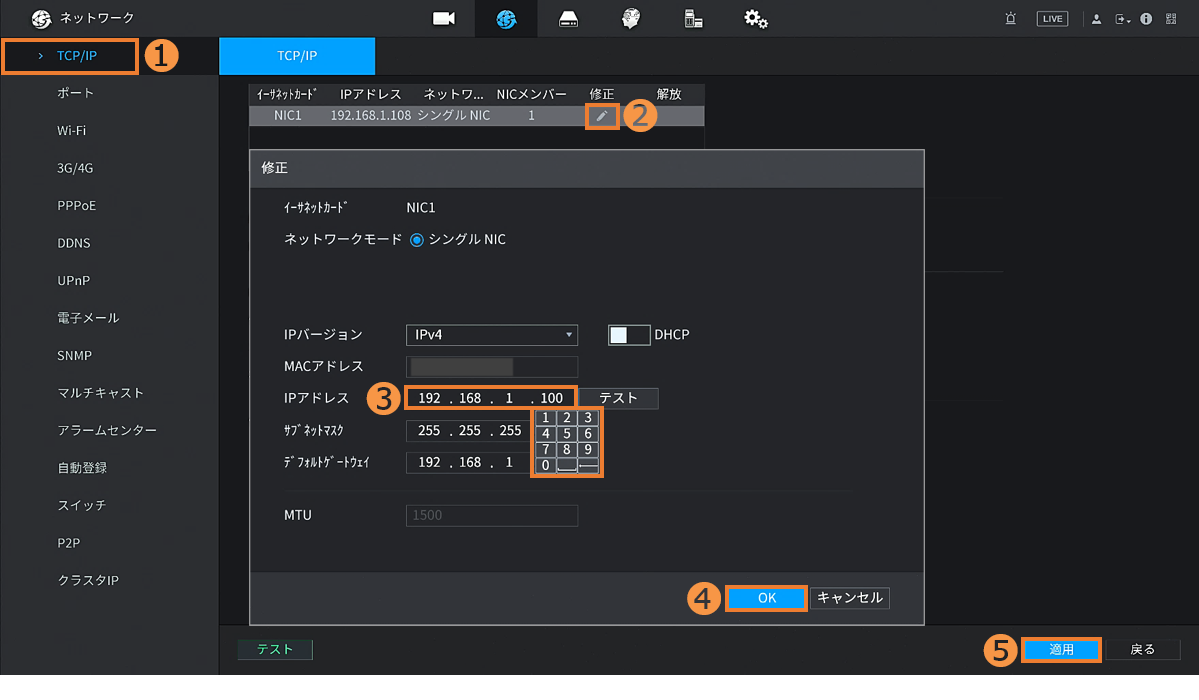 ❶[TCP/IP] > ❷[修正] > ❸[IPアドレス]を押下し、ホスト部を任意の数値に変更※ > ❹[OK] > ❺[適用]をクリックします。