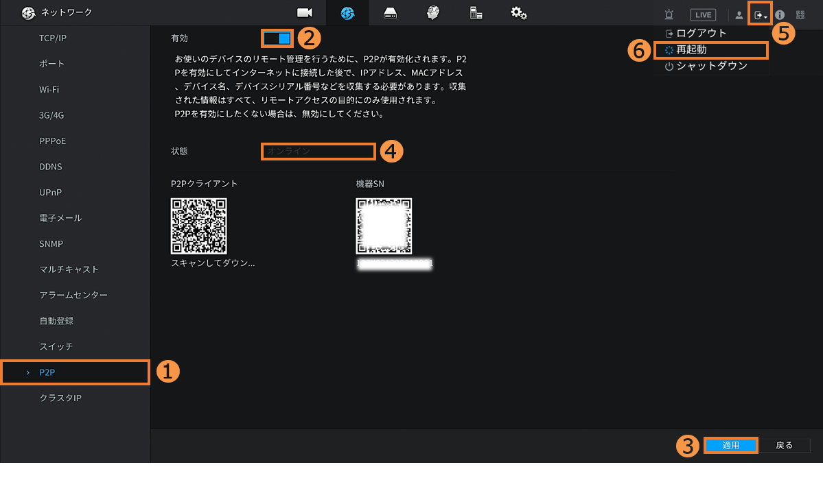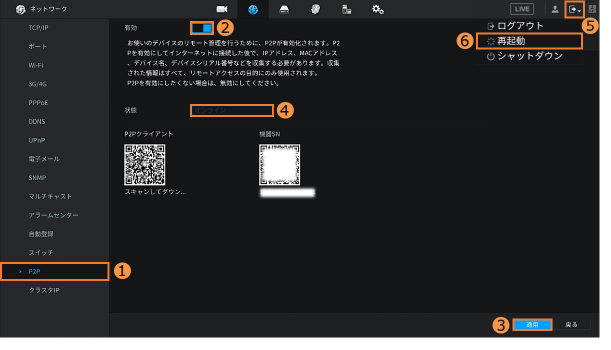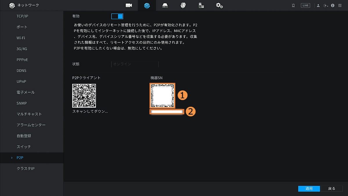 ❶[P2P] > ❷[有効]のスライドバーを押下し「有効=青色」へ変更 > ❸[適用] > 右クリックでメインメニューへ戻り再度、同画面へ戻ってください。