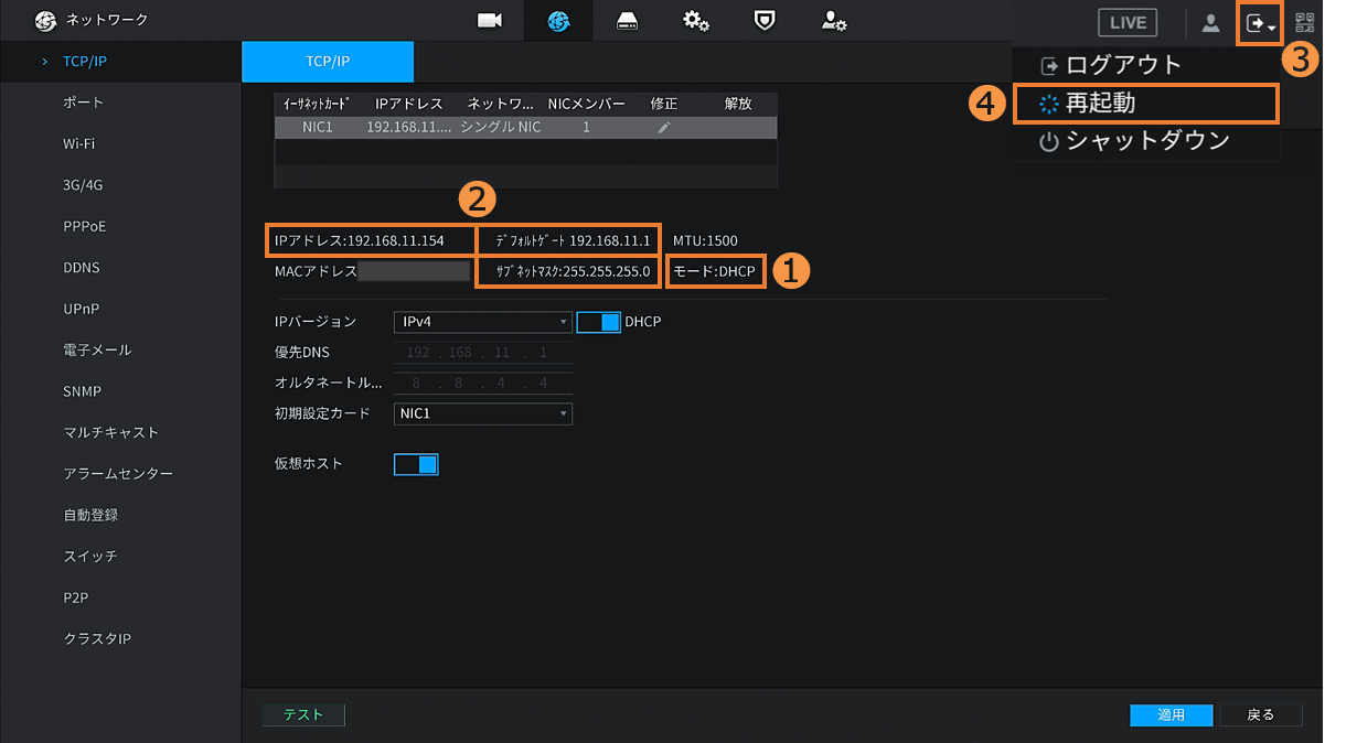 ※更新されない場合は、❸[ログアウト]アイコンから❹[再起動]をクリックし、レコーダーの再起動を実施してください。
