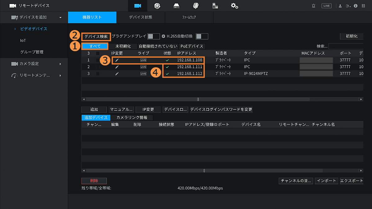❶[すべて] > ❷[デバイス検索]※1 > ❸対象のカメラへ[✔]※2 > ❹[追加]をクリックします。