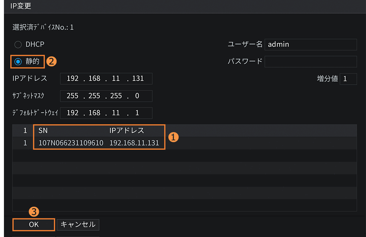 ❶[SN] , [IPアドレス]欄で対象カメラを再確認 > ❷[静 的]を選択 > ❸[OK]をクリックします。