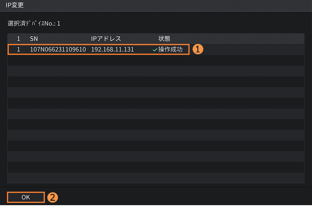 ※1)一覧に表示されなかったり、❺[IPアドレス]が変更されていない場合は、反映までにタイムラグがあるため、❷[デバイス検索]を再度クリックしてください。