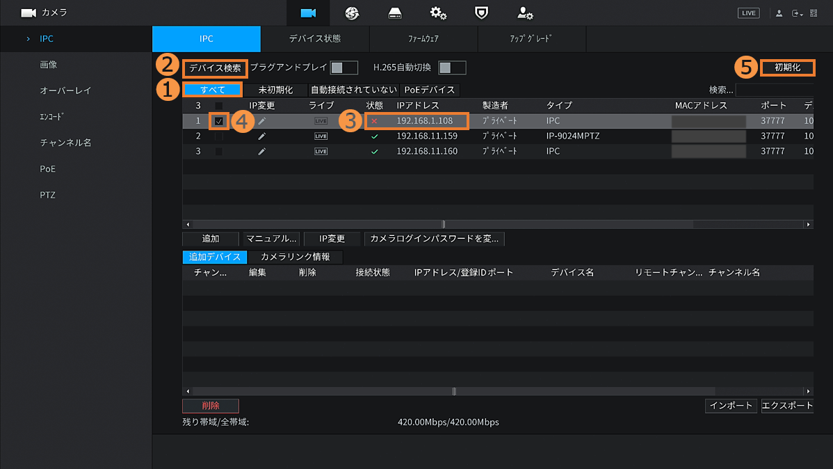 ❶[IPC] > ❷[IPC] > ❸[未初期化] > ❹[デバイス検索] > ❺対象のカメラへ[✔]※ > ❻[初期化]をクリックします。