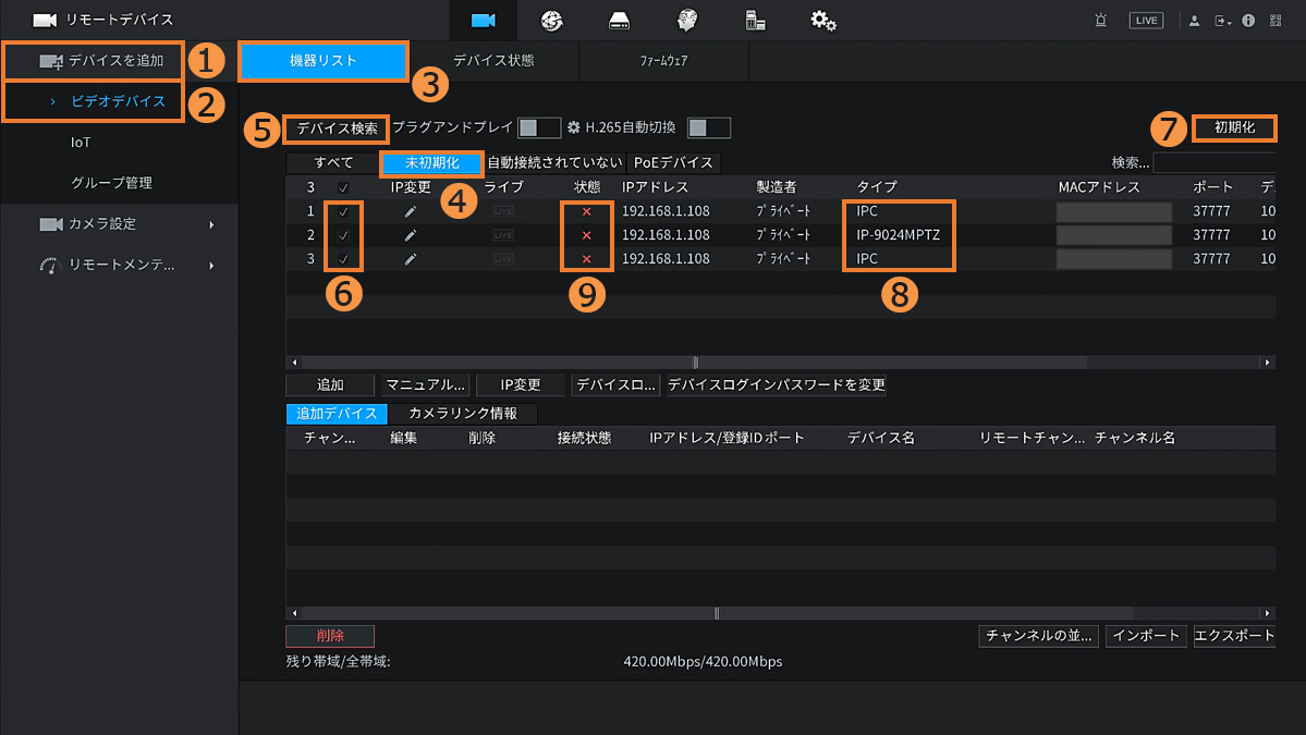 ※❽[タイプ]が[IPC・IP Camera・IP PTZ Camera・カメラ型番等]=カメラ、❾[状態]が[✖]=未初期化デバイスです。