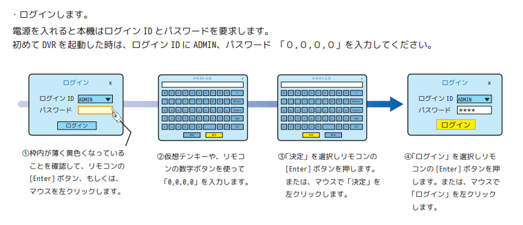 AHD製品やEXーSDI製品の同軸レコーダーの初期パスワードは「0000」(数字の0が4つ)です。パスワードをお忘れの場合は修理対応となります。恐れ入りますが、その際はご購入いただいた販売店にご相談くださいますようお願い申し上げます。
