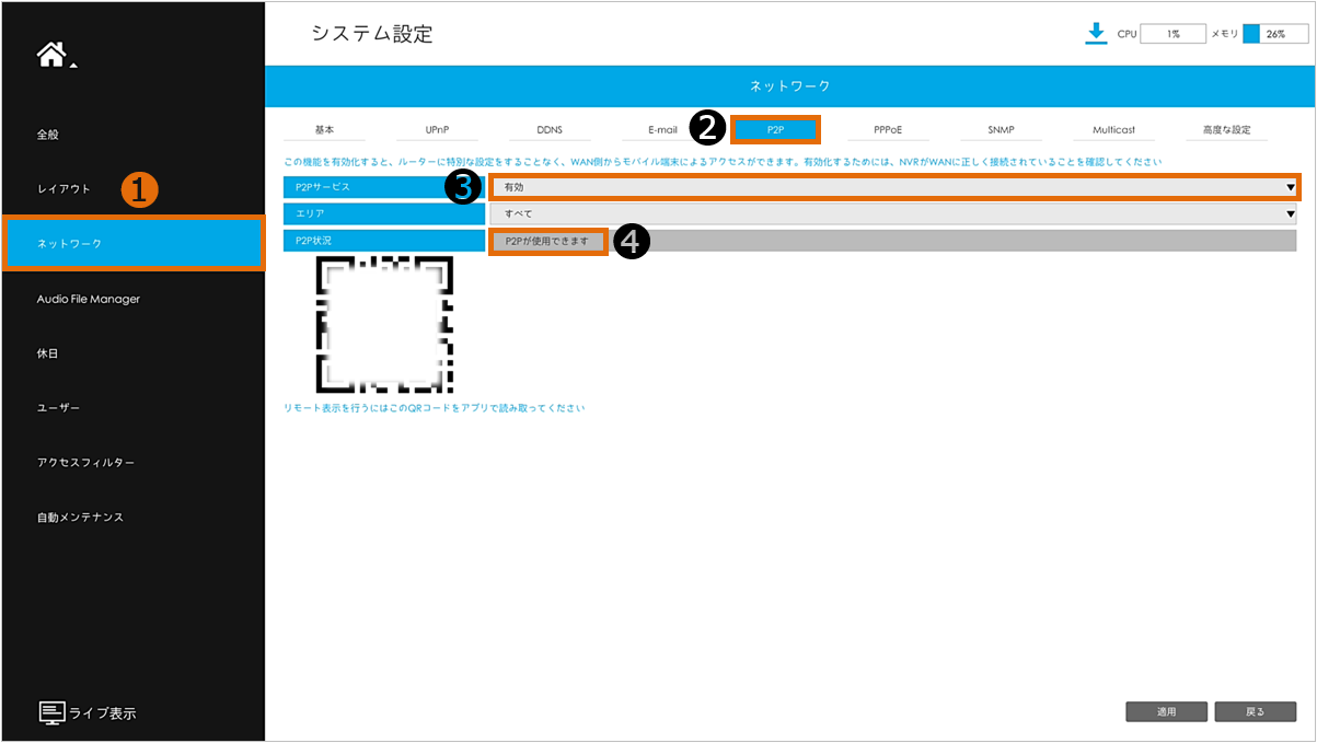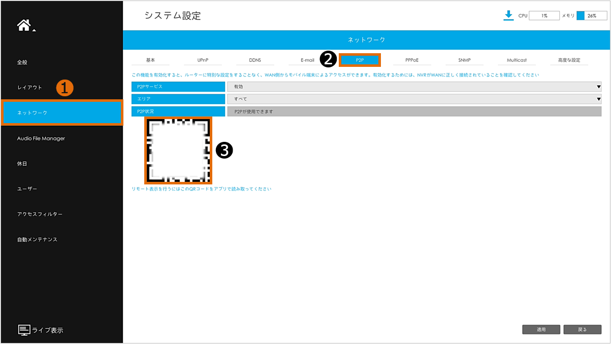 ❶レコーダーの[P2Pステータス]が[P2Pがご使用できます]の表示になっていることをご確認ください。