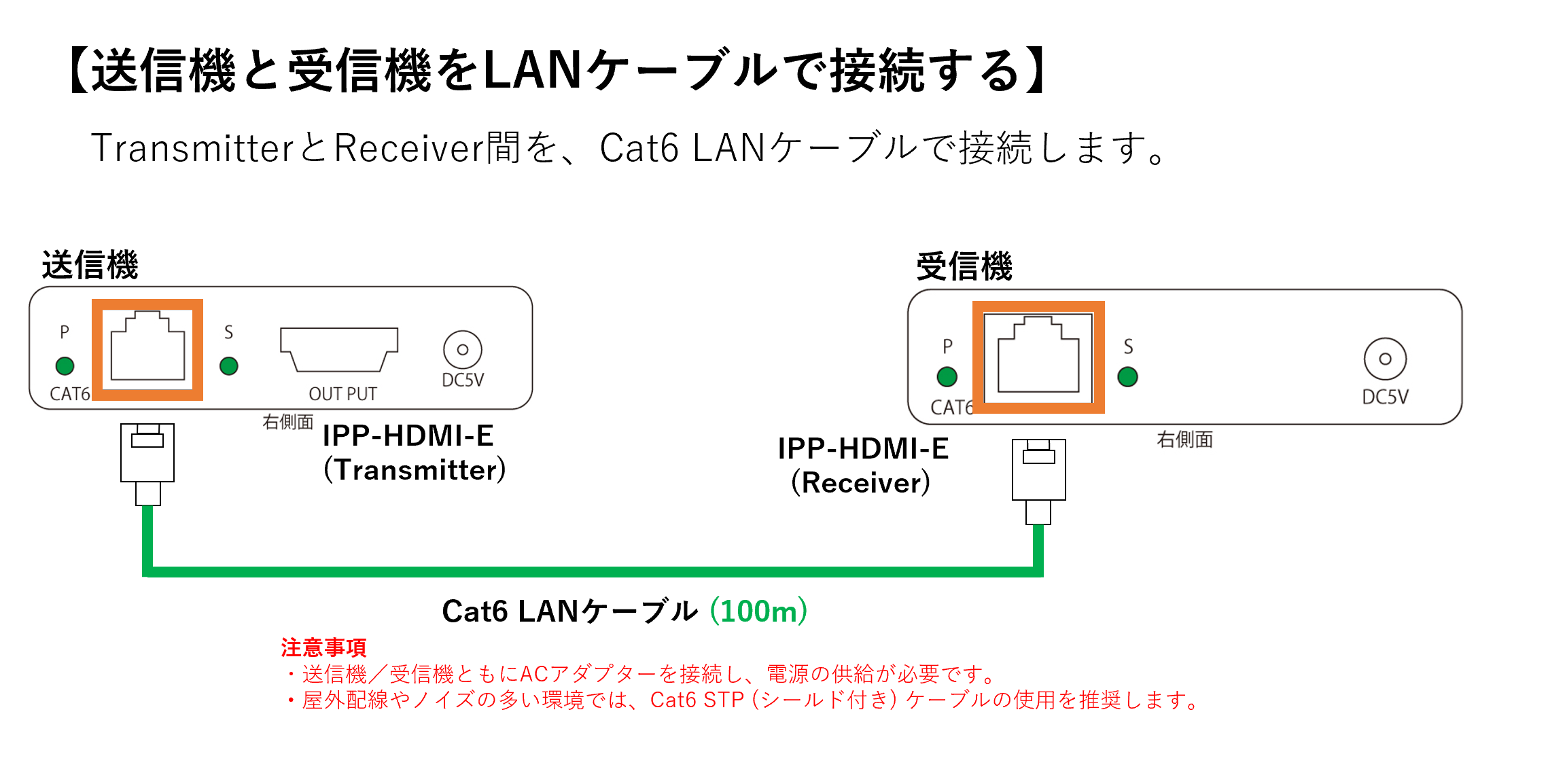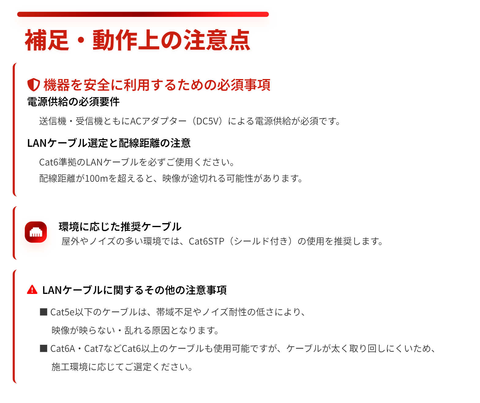 | HDMIケーブル | 送信側/受信側とも最大3m推奨 |