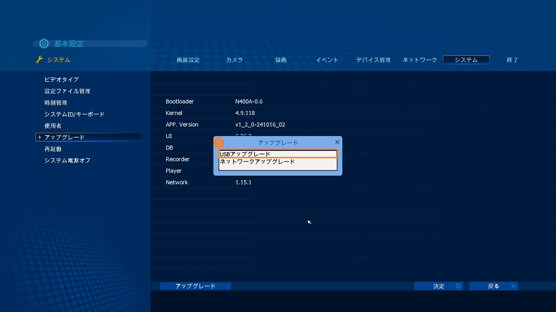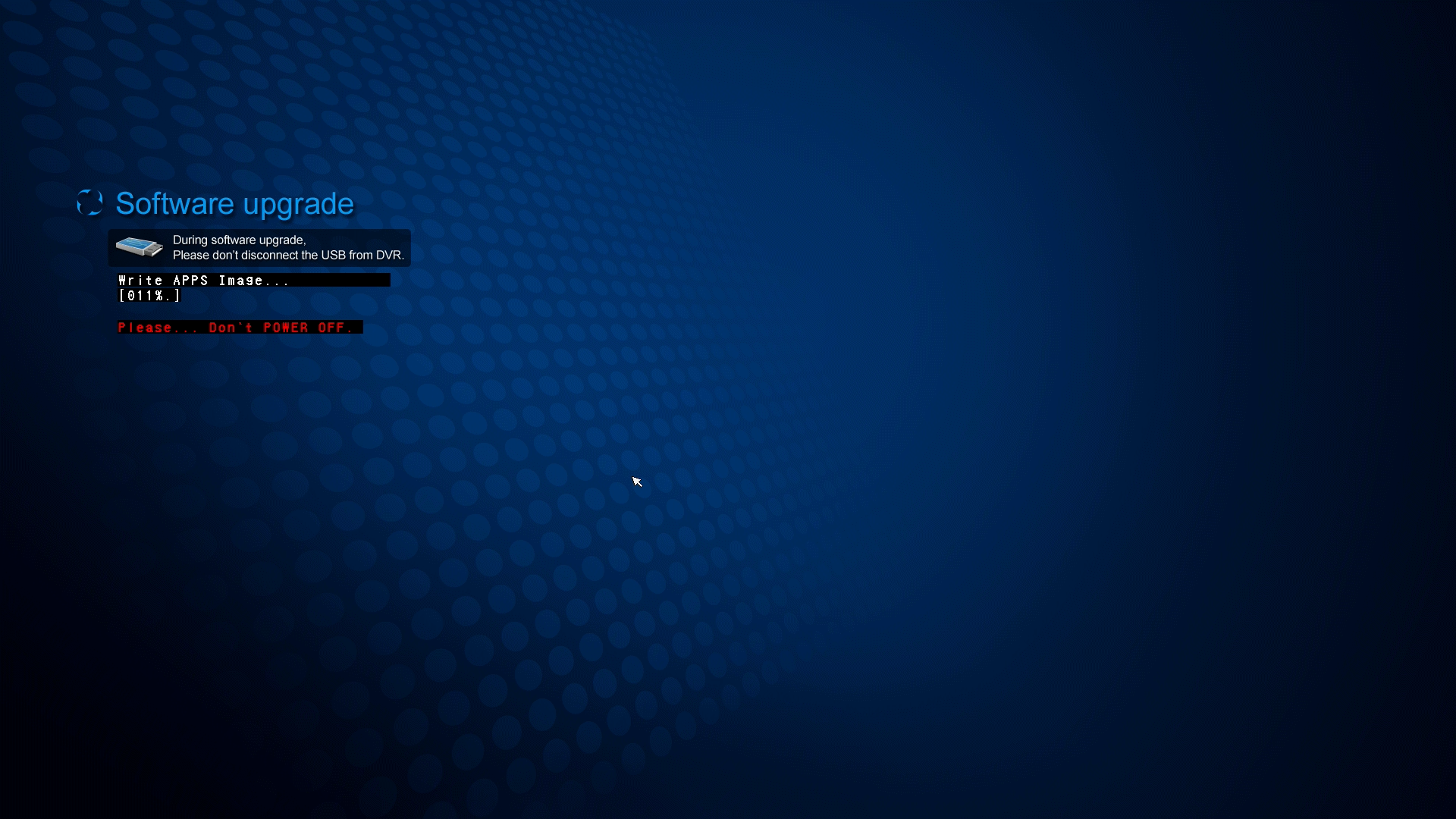 事前に弊社HPの製品ページより対象の録画機のアップグレードファイルをダウンロードした後USBメモリに入れ、録画機に挿入してください。
