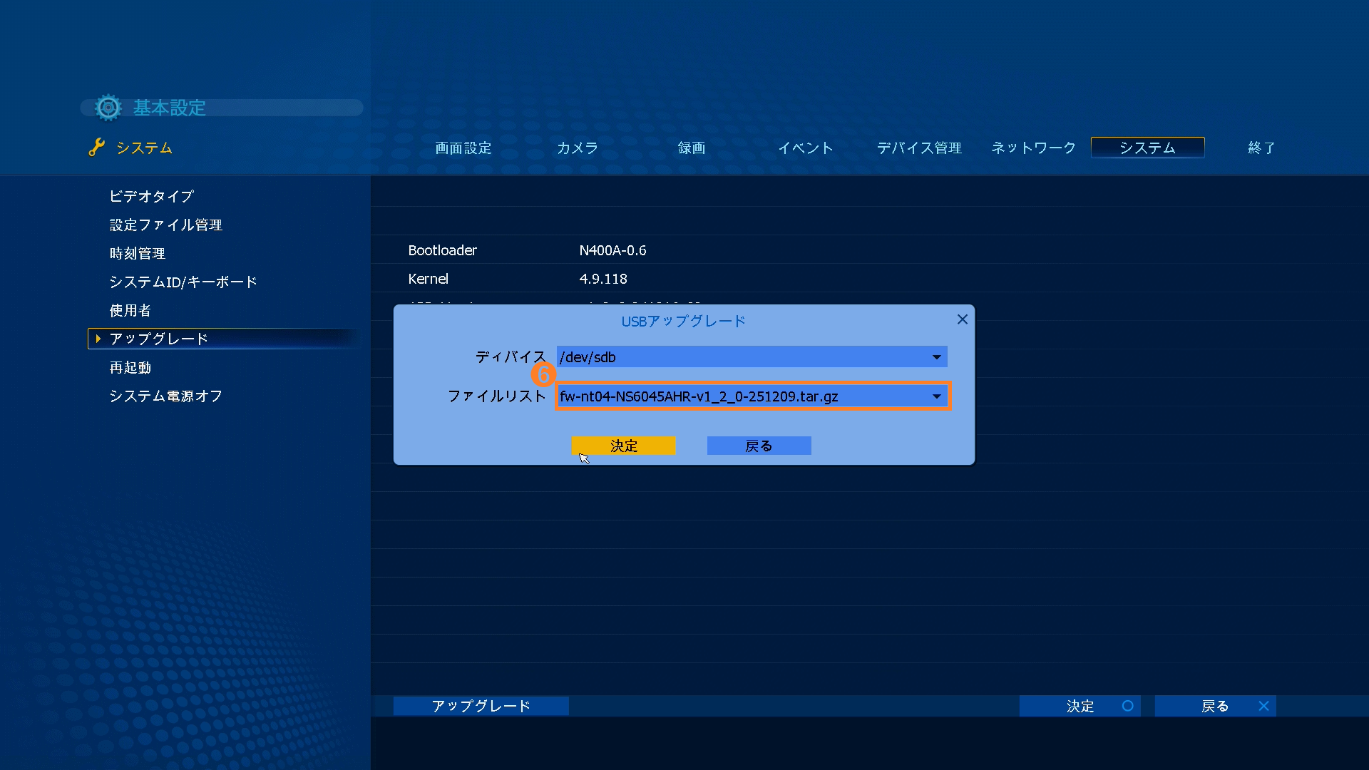 ❻ ディバイスが/dev/sdbになっている ことを確認し、ファイルリストからアップグレードファイルを選んで決定を押します。