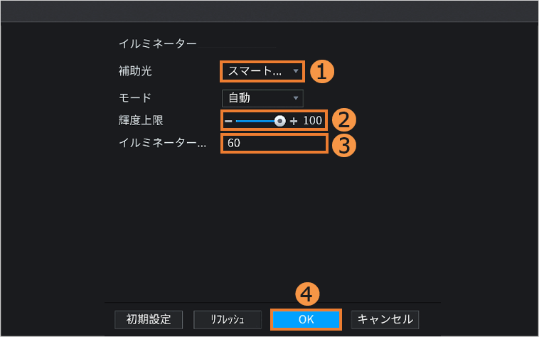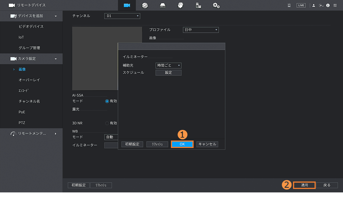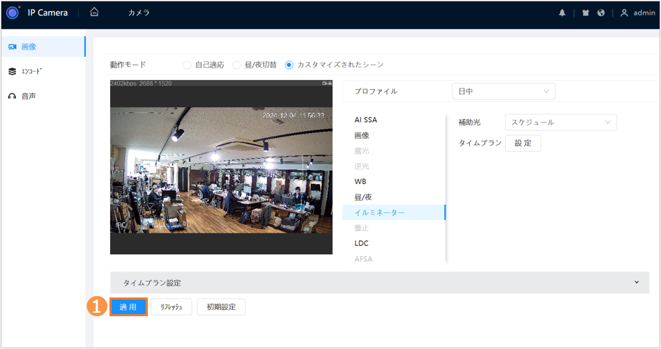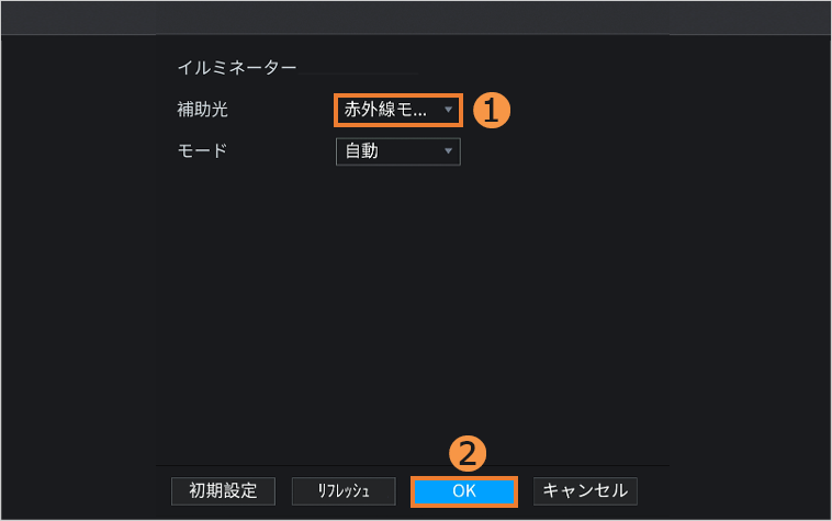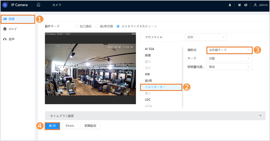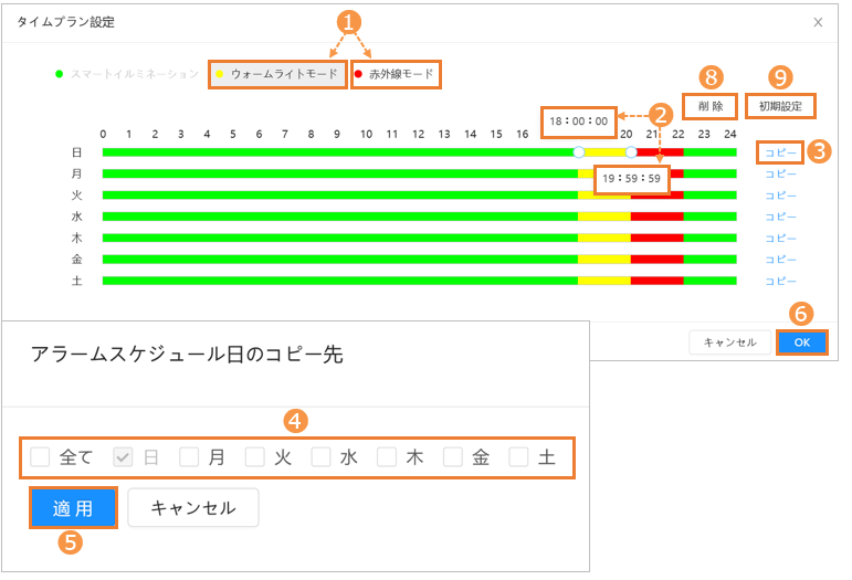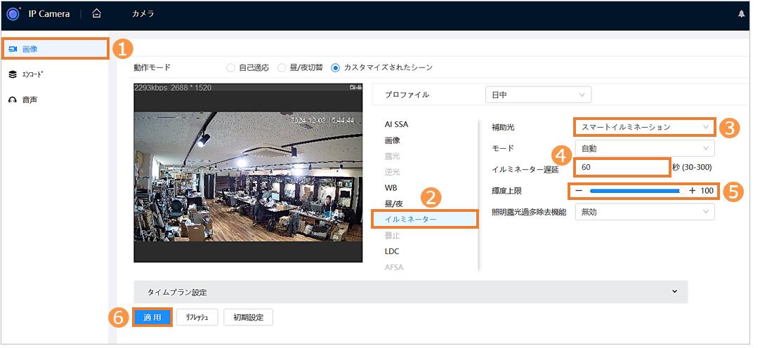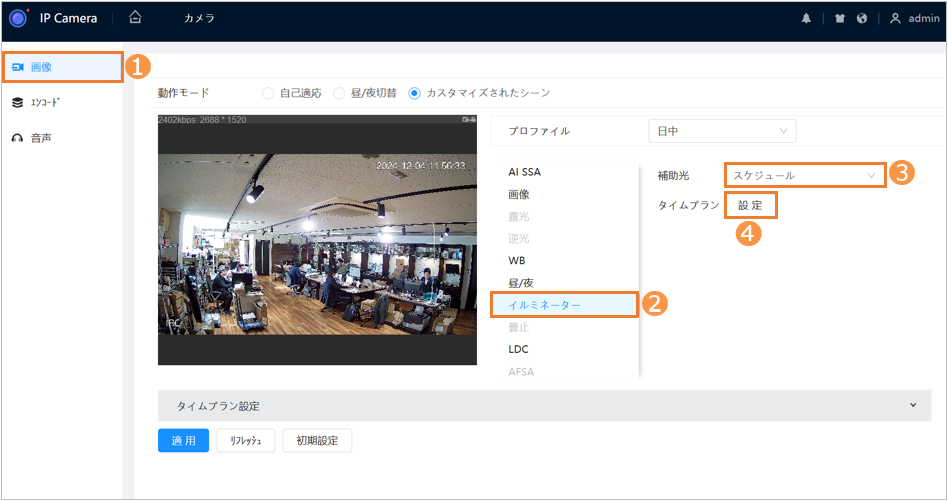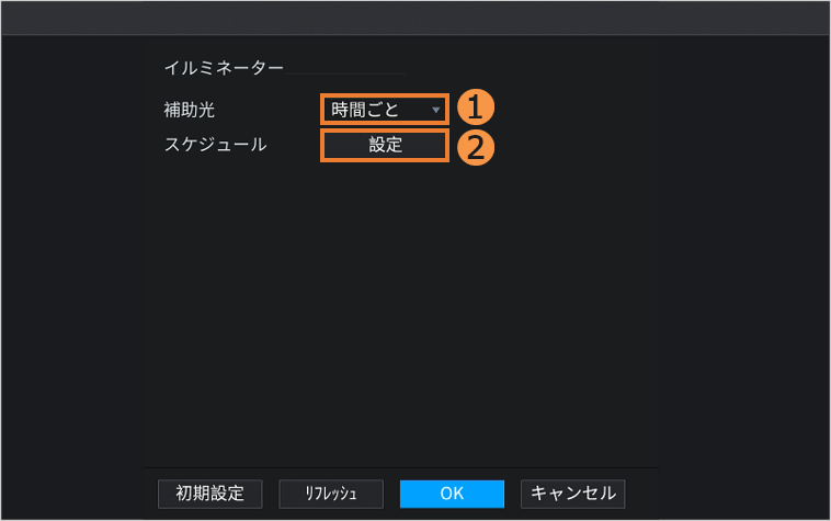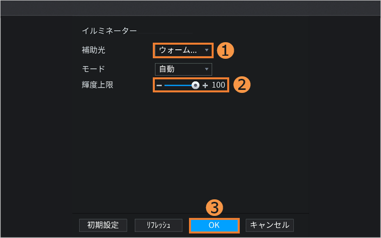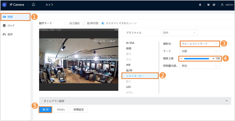 [IP-8834AI-AG / 5834AI-AG]アクティブガードカメラのウォームライト(暖色LED)の明るさと点灯継続時間および、補助光モードを変更する設定方法